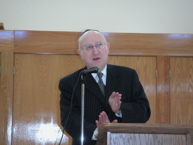 Rabbi Dr. Aaron Levine, Chairman, Department of Economics, Yeshiva University, addressing the Congregation at the 2007 JUF Brunch. Rabbi Dr. Levine discussed "Milton Friedman and the Free Market vs. Halacha," in which he compared Friedman's opinion on the military draft and vouchers for education with the view of Halacha on these issues.